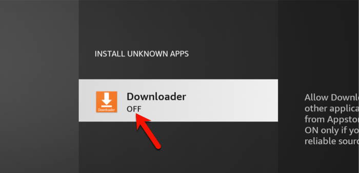 12-We have downloaded the .APK file via Downloader to install TiviMate and we tried to execute the file with it, that's why the permission should be given to Downloader. As you can see, the permission is now set to OFF. While it is highlighted, click the center button on the remote once.