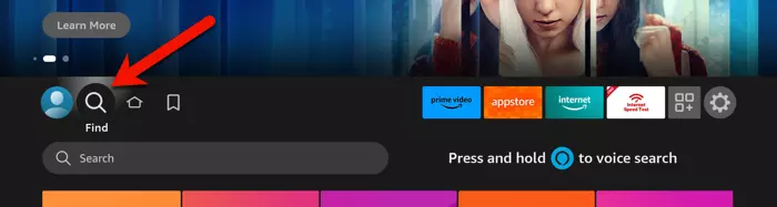 1-From the dashboard of the Firestick, go on Find icon and then once the search field appears click the downward arrow on the remote and click OK so the virtual keyboard shows up.